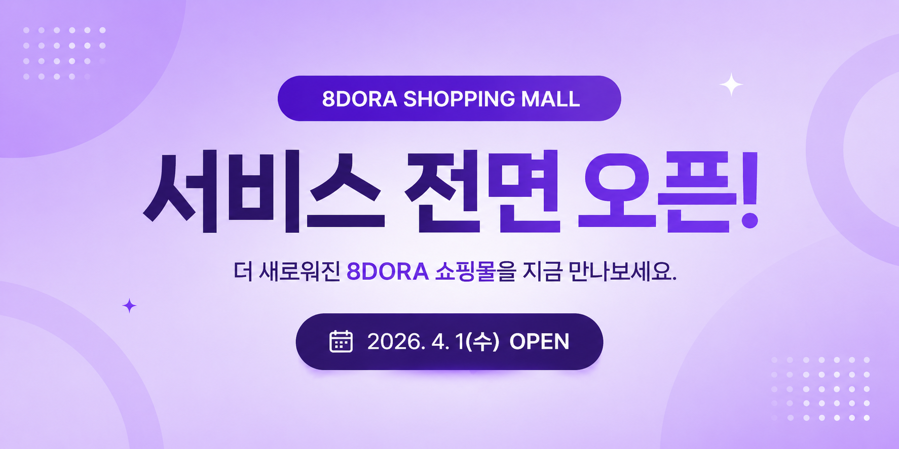 많은 관심과 성원 속에 8DORA 쇼핑몰 서비스가 2026년 4월 1일부터 전면 오픈되었습니다.