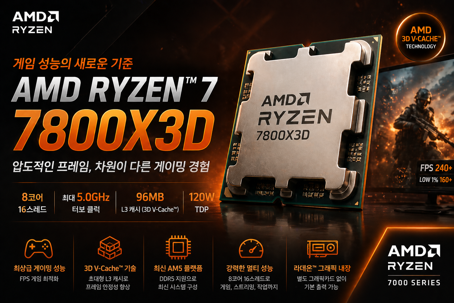 AMD 라이젠7 7800X3D는 3D V-Cache 기술을 기반으로 게이밍 성능에 최적화된 하이엔드 CPU입니다.